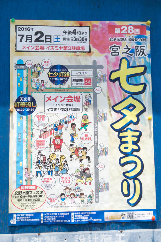 | 7/2(土) 16:00〜 | 第28回 宮之阪七夕まつり | イズミヤ第3駐車場 →地図 →張り紙 灯篭流し・コンサート有 |