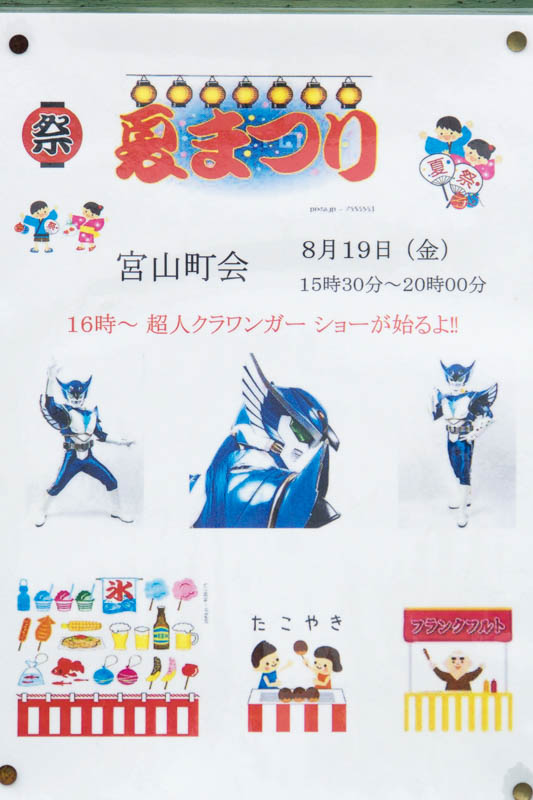 | 8/19(金) 15:30〜20:00 | 夏まつり | みややま公園 →地図 →張り紙 超人クラワンガーショー有 |