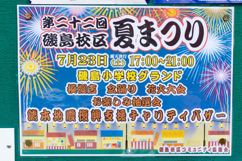 | 7/23(土) | 第22回 磯島校区夏まつり | 磯島小学校 →地図 →張り紙 花火・盆踊り・チャリティバザー有 |