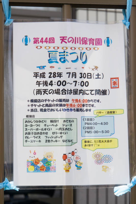 | 7/30(土) 16:00〜19:00 | 第44回 天の川保育園 夏祭り | 天の川保育園 →地図 →張り紙 バザー・ミニ花火大会有 |