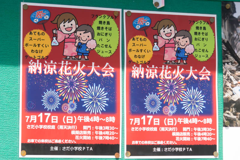 | 7/17(日) 16:00〜20:00 | 納涼花火大会 | さだ小学校 →地図 →張り紙 花火有 |
