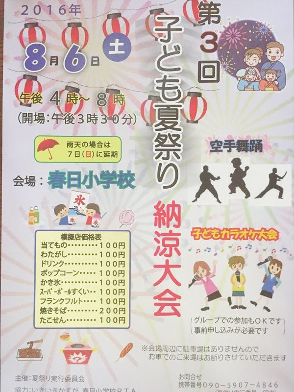 | 8/6(土) 16:00〜20:00 | 第3回 子ども夏祭り 納涼大会 | 春日小学校 →地図 →張り紙 カラオケ・空手舞踊有 |