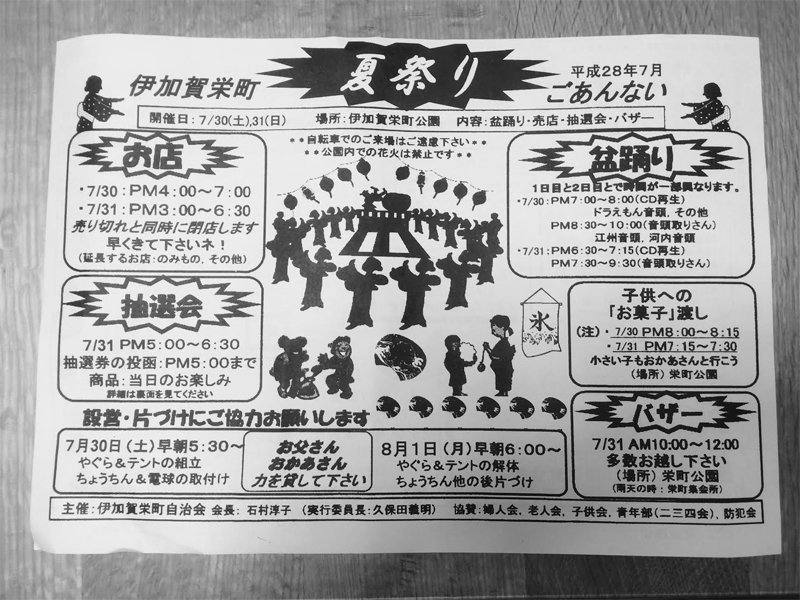 | 7/30-31(土日) 16:00〜 15:00〜 | 栄町盆おどり大会 | 伊加賀栄町公園 →地図 →張り紙 / 2 / 3 盆踊り・2日目はバザー有 |