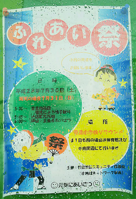 | 7/23(土) 16:00〜20:30 | 第5回 香陽七夕けんぎゅう祭り | 香陽小学校 →地図 →リンク →去年のレポ 盆踊り・花火有 |