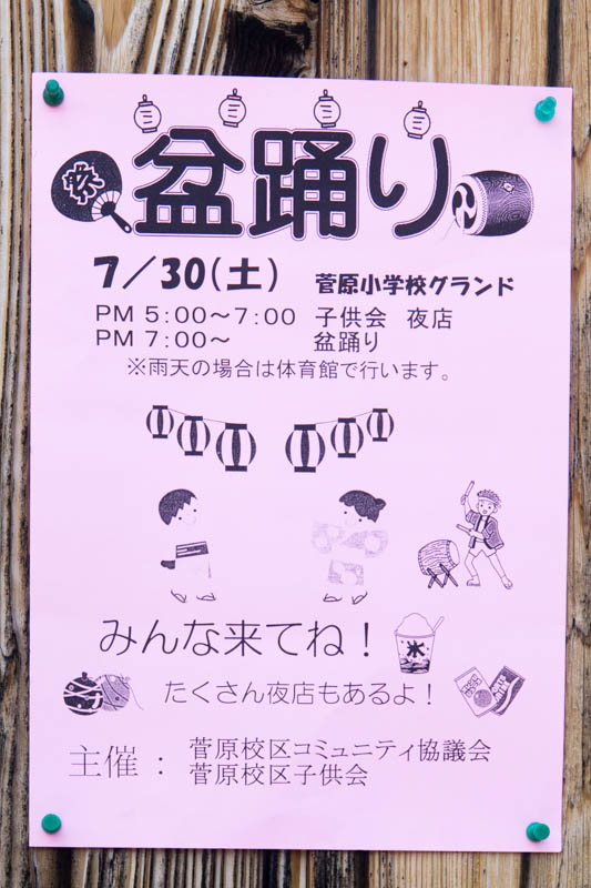 | 7/30(土) 17:00〜19:00 | 盆踊り | 菅原小学校 →地図 →張り紙 盆踊り有 |