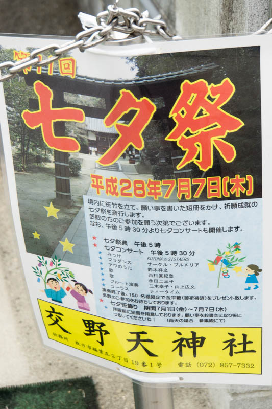 | 7/7(木) 17:00〜 | 第11回 七夕祭 | 交野天神社 →地図 →張り紙 コンサート有 |