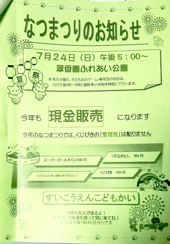 | 7/24(日) 17:00〜 | なつまつり | 翠香園ふれあい公園 →地図 →張り紙 花火有 |