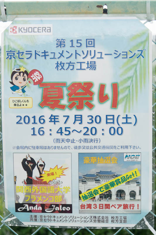 | 7/30(土) 16:45〜20:00 | 第15回 京セラドキュメントソリューションズ枚方工場夏祭り | 京セラドキュメントソリューションズ枚方工場 →地図 →張り紙 ひこぼしくんが来る・フラメンコ・抽選会有 |