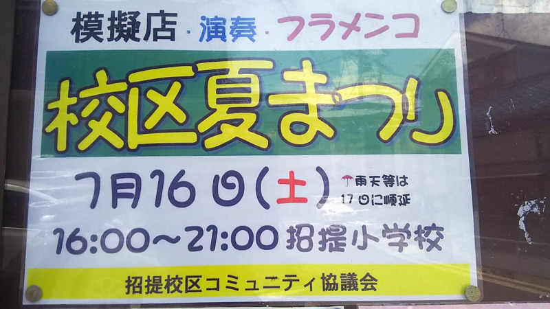| 7/16(土) | 第14回校区夏祭り | 招提小学校 →地図 →張り紙 花火・フラメンコ有 |