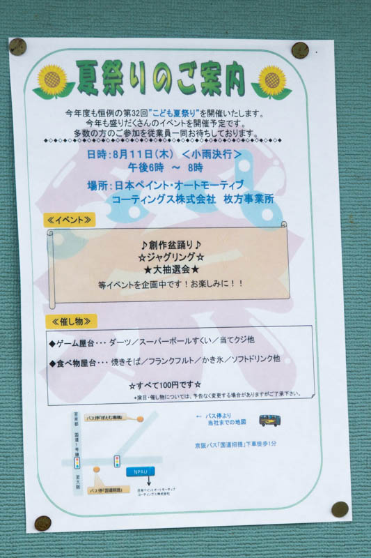 | 8/11(木) 18:00〜20:00 | 第32回こども夏祭り | 日本ペイント・オートモーティブコーティングス株式会社枚方事業所 →地図 →張り紙 盆踊り・抽選会有 |