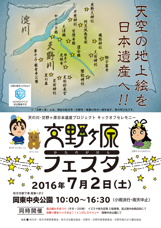 | 7/2(土) 10:00〜16:30 | 交野ヶ原フェスタ | 岡東中央公園 →地図 →張り紙 Ingressイベント有 |