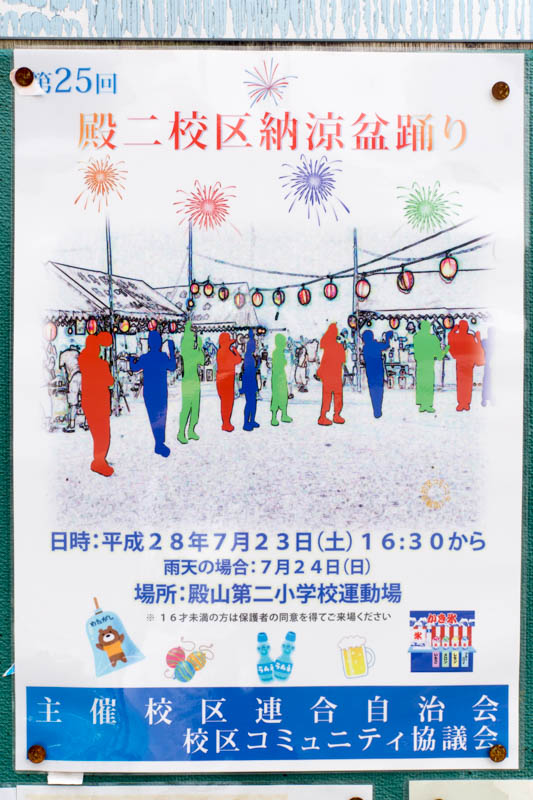 | 7/23(土) | 第25回 殿二校区納涼盆踊り | 殿山第二小学校 →地図 →張り紙 盆踊り有 |