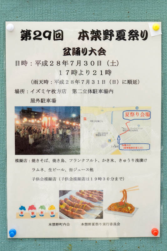 | 7/30(土) | 第29回 本禁野夏祭り 盆踊り大会 | イズミヤ第二駐車場 →地図 →張り紙 盆踊り有 |