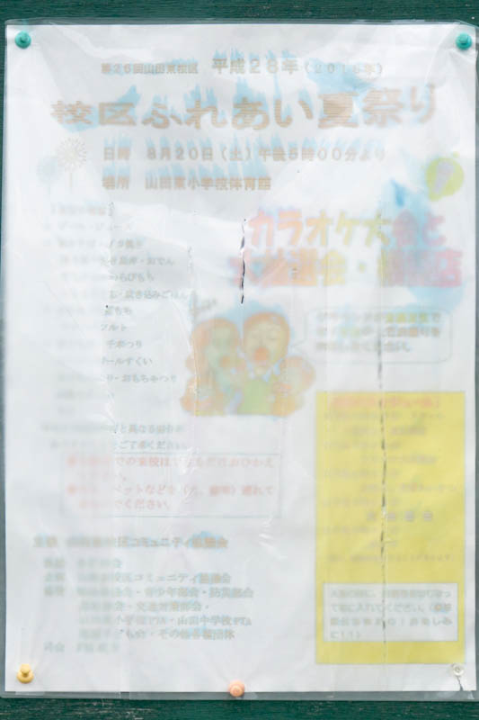 | 8/20(土) 17:00〜 | 第26回 山田東校区 平成28年(2016)校区ふれあい夏祭り | 山田東小学校 →地図 →張り紙 抽選会有 |