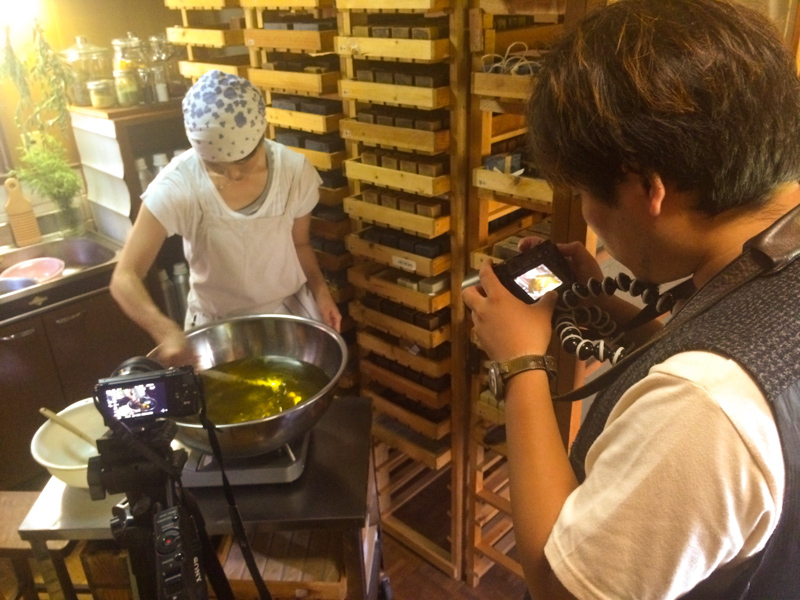 スタッフさんが石鹸を作る様子をいろんな角度から撮影するすどん。