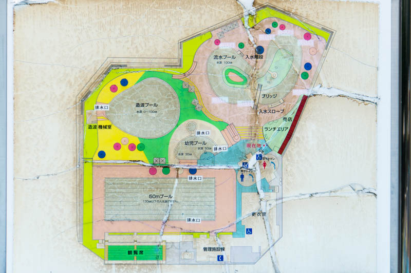 プールは全4種類。右上の流水プール、左上の造波プール、真ん中の幼児プール、そして下部の50mプールの4つです。