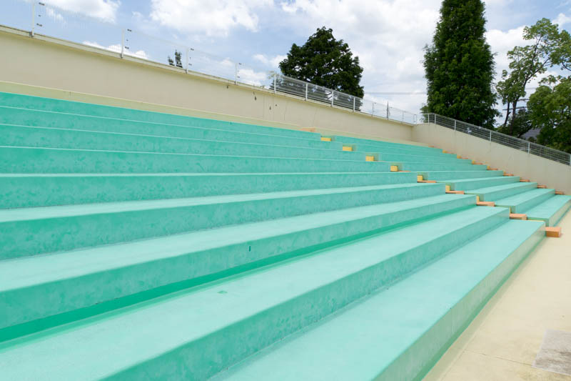 50mプールの隣には客席的なところが。普段はここで体を焼いている人がよく寝転んでいるそうです。