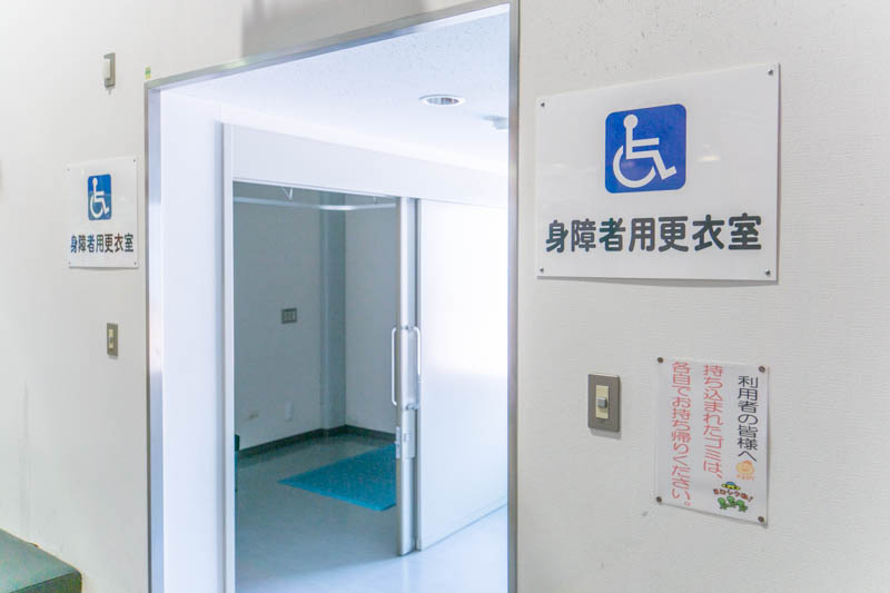 更衣室のそばには身障者用更衣室も設置されていて、ここは判断に悩む年頃の異性のお子さんと一緒に着替える際にも利用したりすることもできるそう。