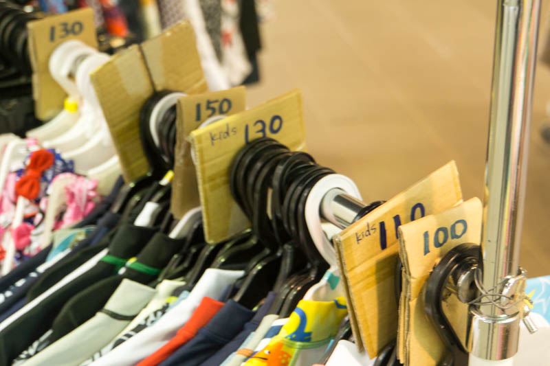 水着の販売もあり、ちょうど値札が写っている中央の黒い水着は1600円。