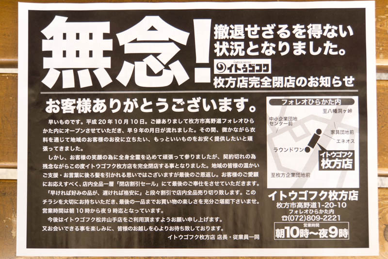 フォレオひらかた内のイトウゴフク、9月10日で閉店