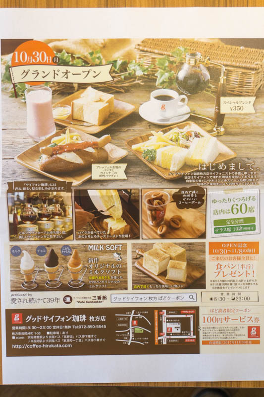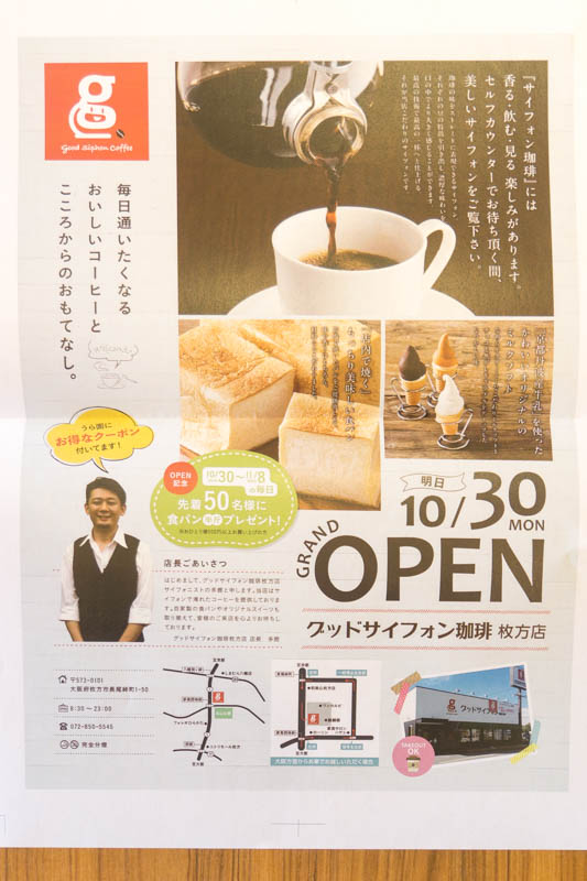 グッドサイフォン珈琲はCONOBA香里ヶ丘にある「Cafe Sanbankan plus」の系列店。名前の通りサイフォン式の珈琲をメインとするお店です。