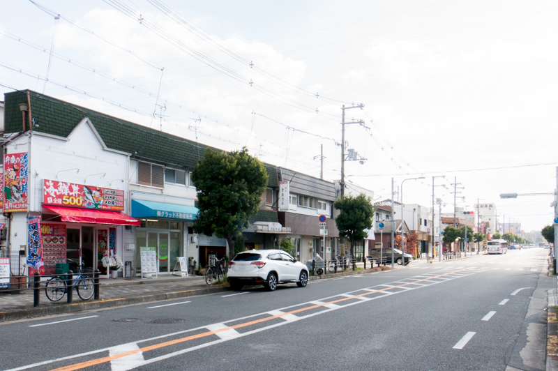 こっちにいくとダイソーやコノミヤなどの前を通って、くずはアベニューとの交差点「楠葉中央」にでます。
