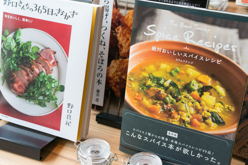 テーマに合わせた本の並べ方にも注目して下さい!書籍だけではなく、キッチン用品や食品も並んでいます。