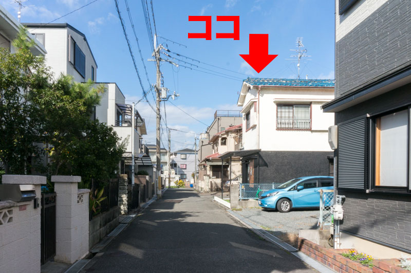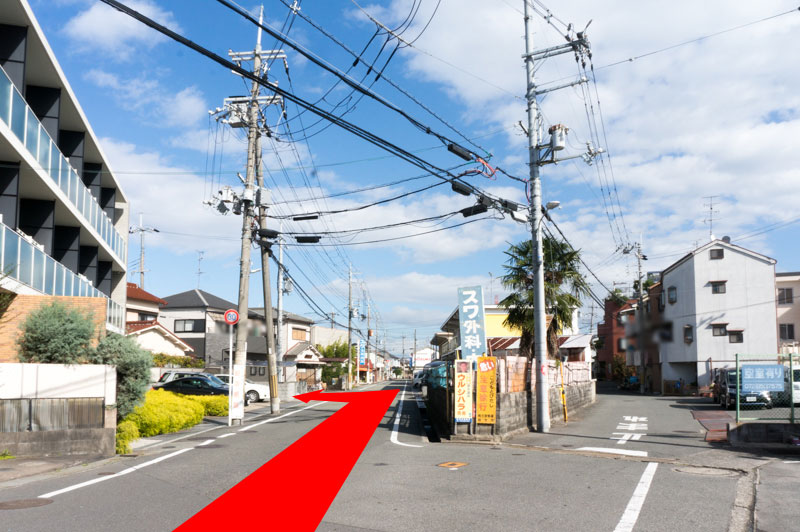 枚方甲斐田郵便局などの前を通ると道が二手にわかれているので、左側の道路に入ってすぐ左折。