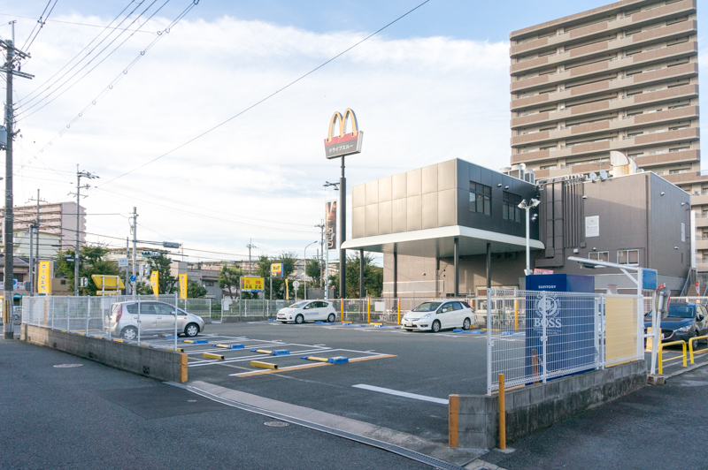 お店の目の前には駐車場のタイムズがあり、その奥にはマクドナルドが。