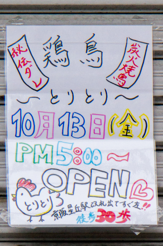 星ヶ丘駅前に「鶏鳥」って焼鳥店ができるみたい。馳どり屋があったところ。10月13日(金)オープン