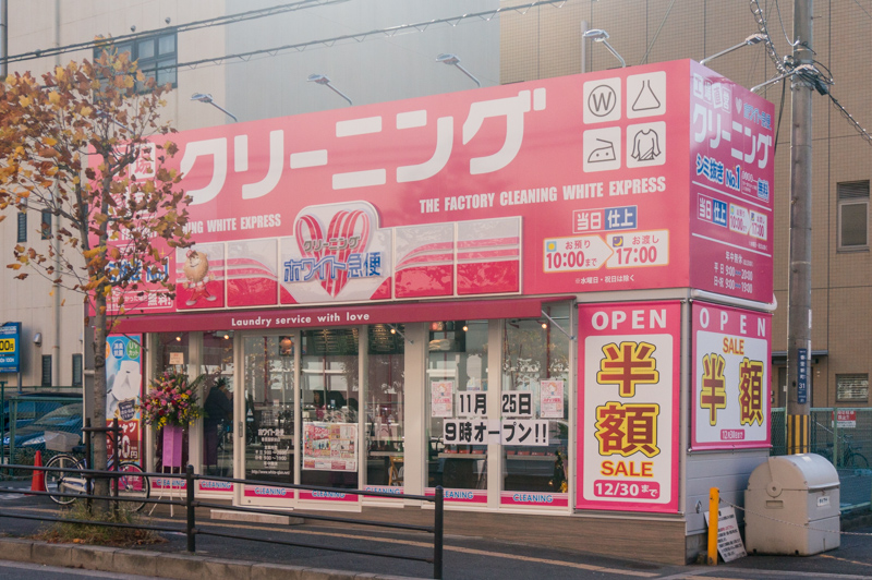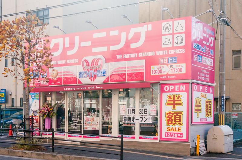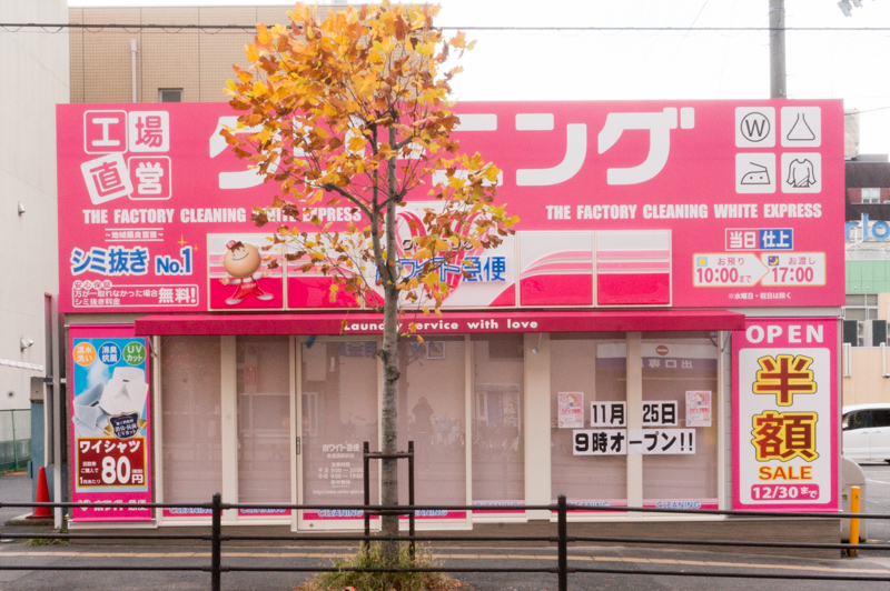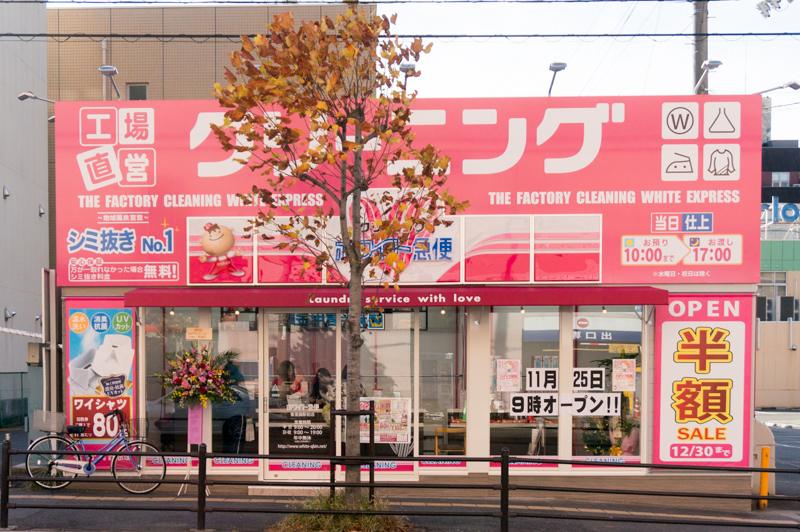 香里園駅前にクリーニング店「ホワイト急便」がオープンしてる。粉もん店あほやがあったところ。外観のインパクト強め