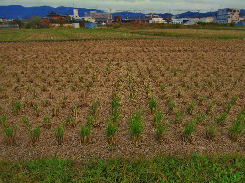稲刈りから少し日がたち、「蘖(ひこばえ)=切株から出る芽=」が見えます。