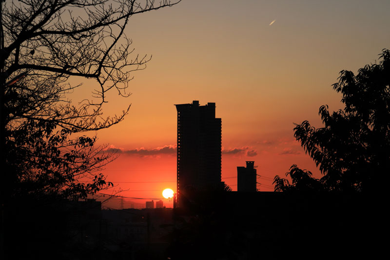 枚方樟葉のタワマンと、夕日と、飛行機雲をいれることができました。