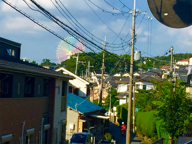 坂道から見た枚方パークの虹色観覧車、緑が残る景色、色んな色や形がある家々、毎日やって来る赤色の配達バイク…。