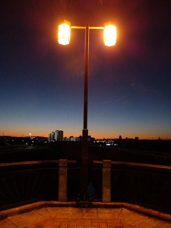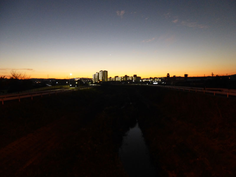 船橋川にかかる橋の上から見た夜明け前のひらかた【枚方フォト】