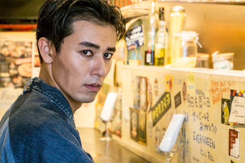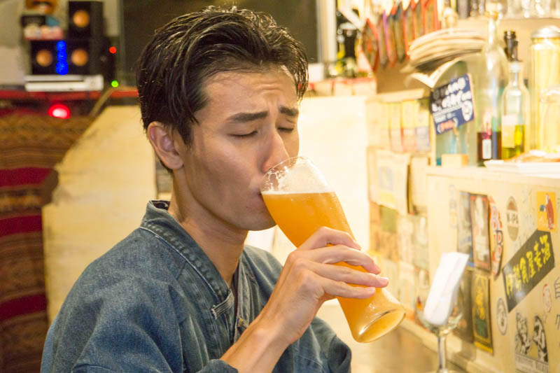 意味深な目でビールを見つめる枚・かた男。口説いてきそうな雰囲気です。