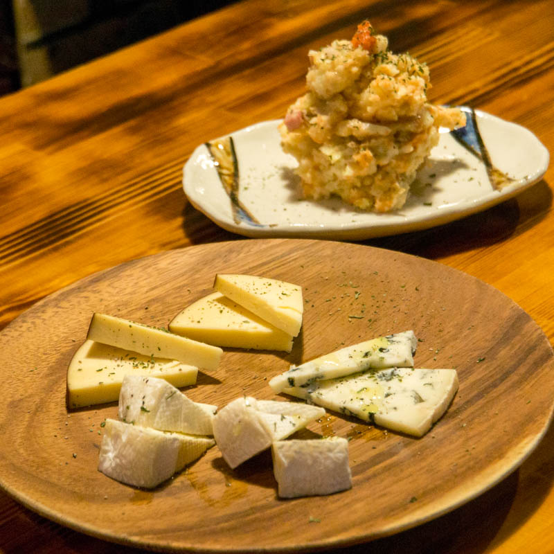 テーブルの上にあるのはこちらもご厚意で提供いただいた「BEERのためのチーズ3種盛り」、そして「明太子のポテトサラダ」です。旨い。