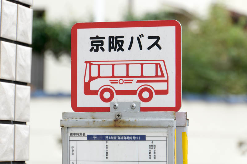 3枚めの写真でズームした、バス停の上部にはいわゆる首的な部分が全くなく、時刻表に京阪バスマークが直付けのところが「まるで脂肪がつきすぎて首が見えない自分の体型のようだ!」と思い親近感がわいたところも高ポイント。