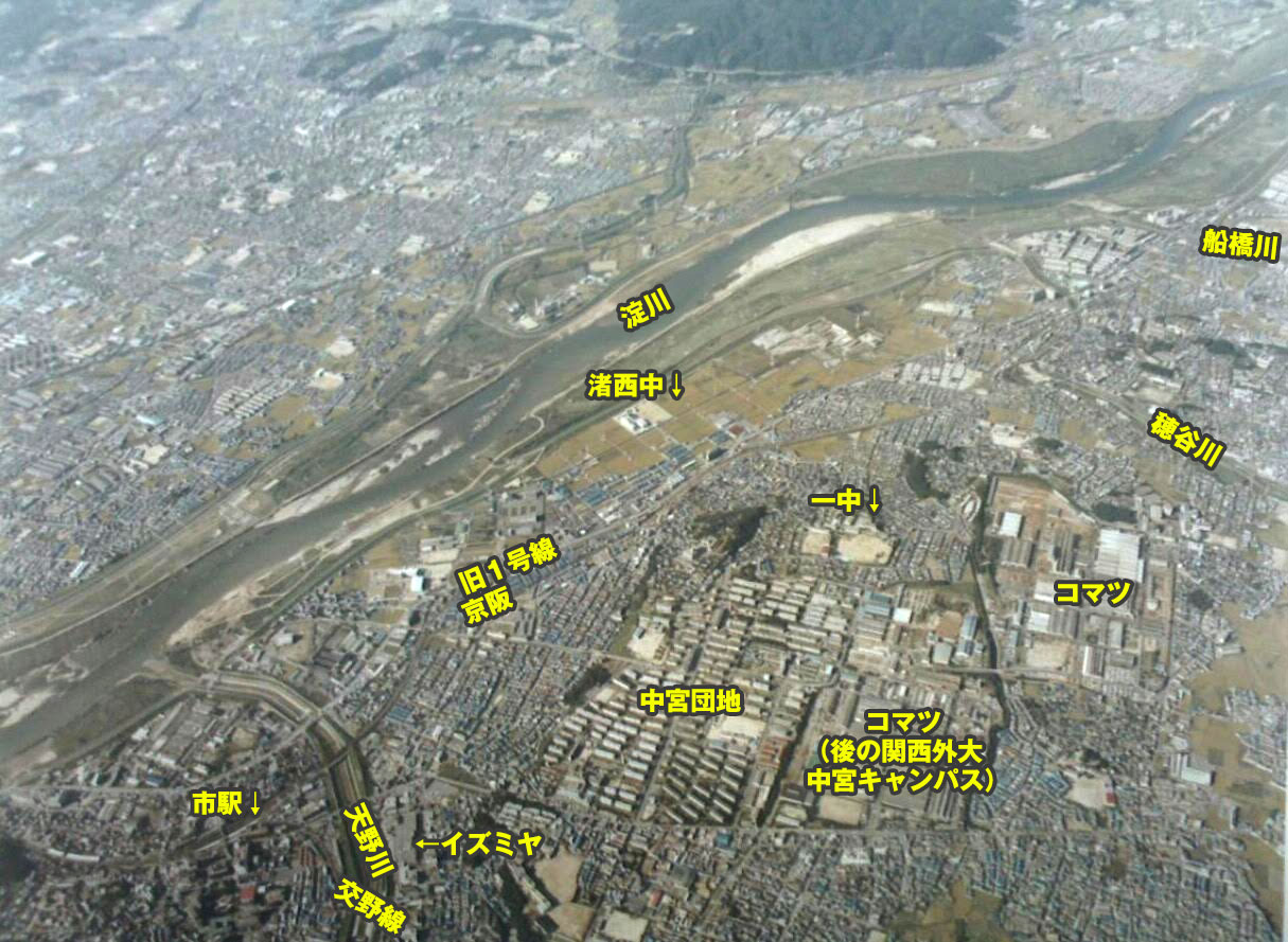 1983年の枚方市駅から牧野駅間あたりの航空写真【枚方フォト】