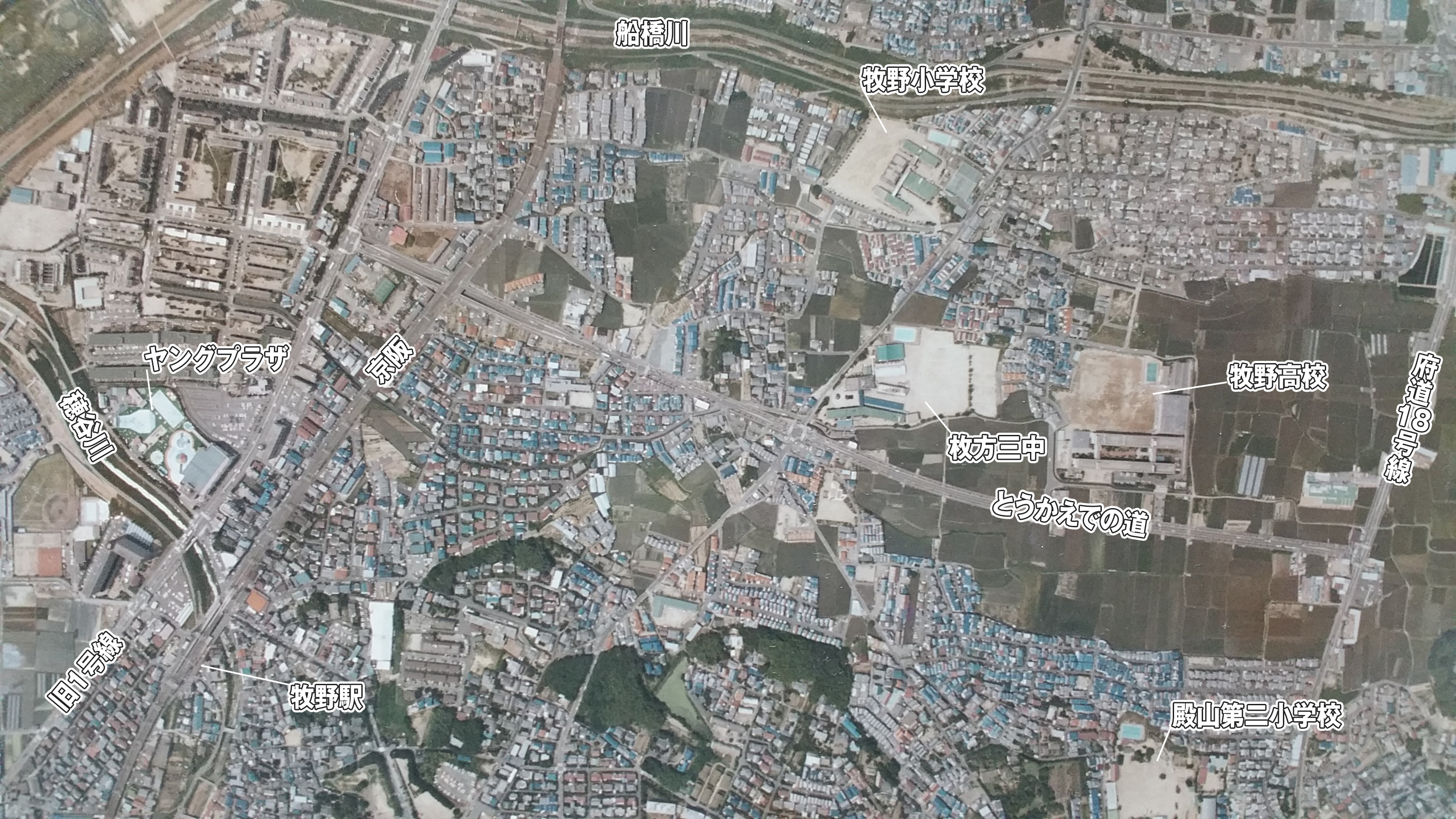 牧野小学校近くの府営船橋住宅もまだ建てられていませんし、牧野駅前のライフのところは駐車場?でしょうか。【追記】駐車場だったそうです!
