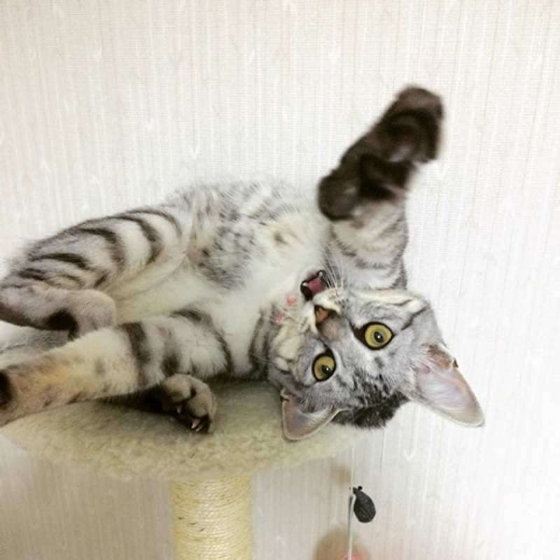 お気に入りの場所は、キャットタワーの一番上! 顔を近づけると猫パンチが飛んでくることも・・・笑