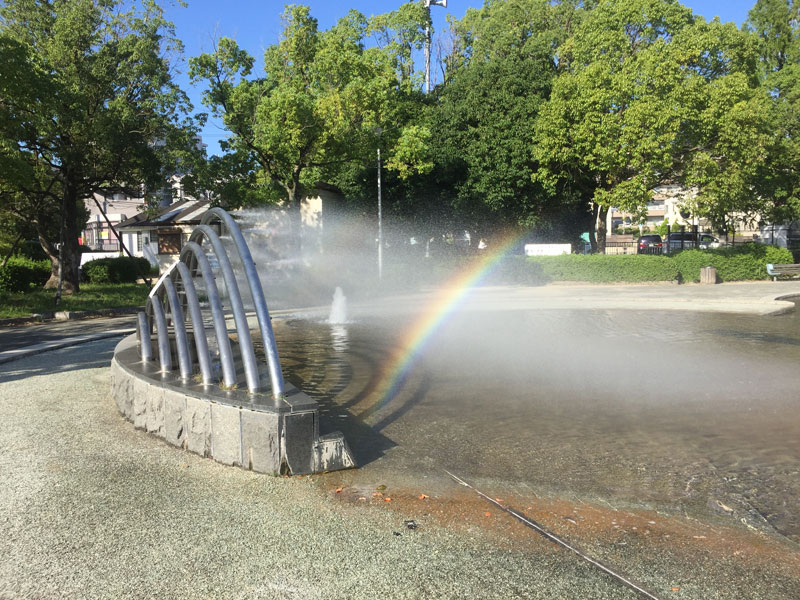 子どもを連れて遊びに行ったら、噴水の水に太陽の光が当たって虹が出来てました。
