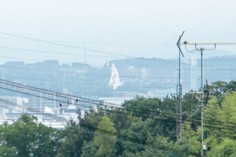 そこからちょうど正面の位置に見える山の方に、何やら三角形の物体が。