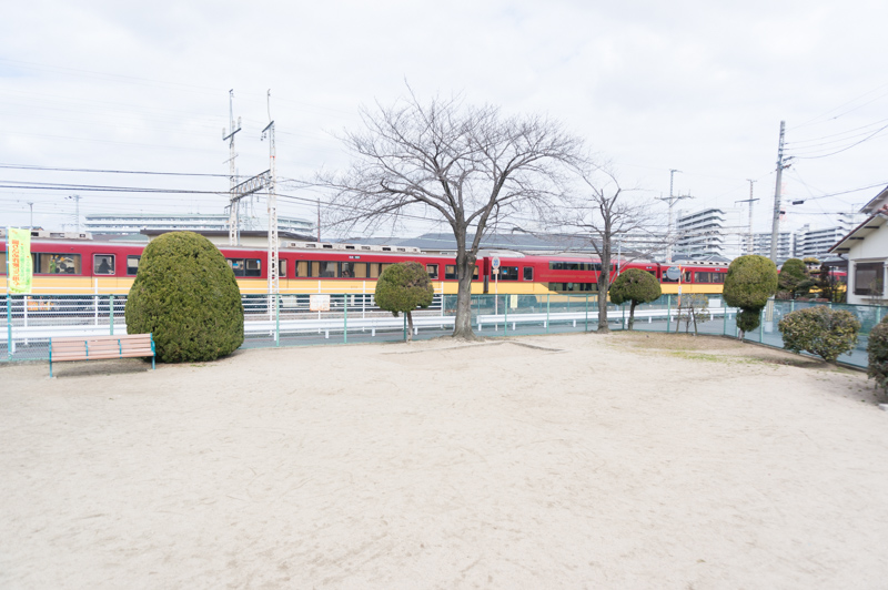京阪本線の線路も見通しがいいので電車もばっちり鑑賞できます。