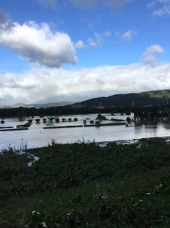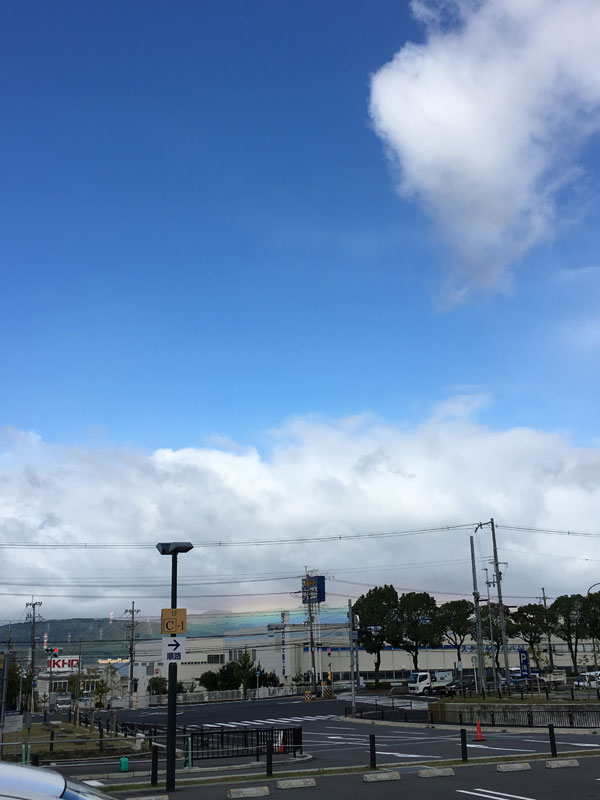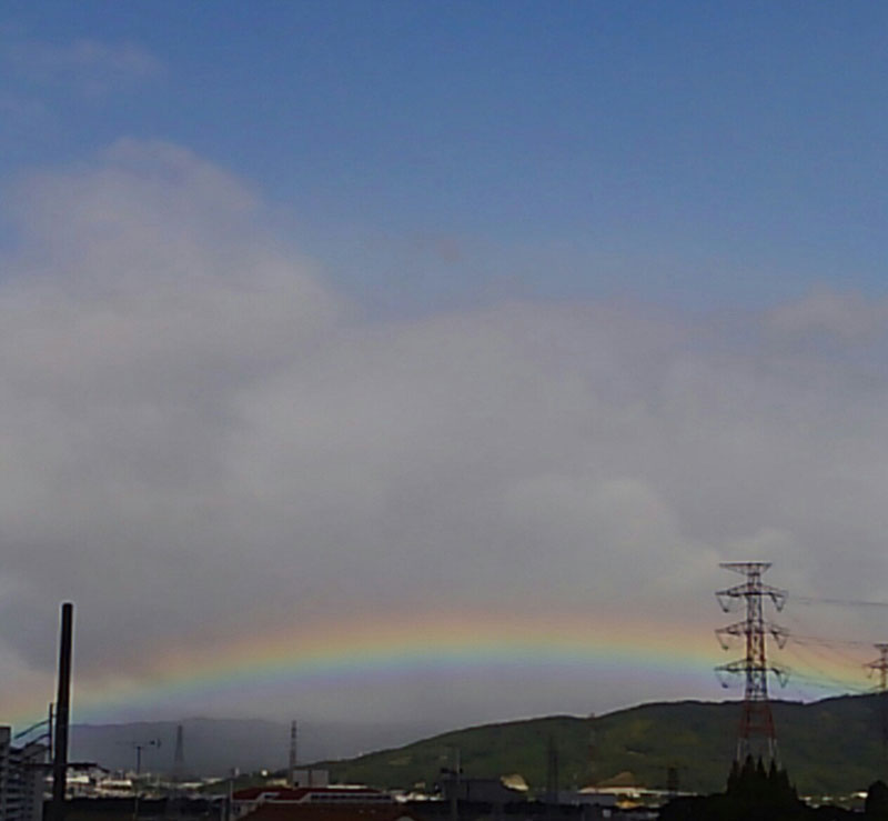 台風一過の朝、低ーい虹が長い時間出ていました。