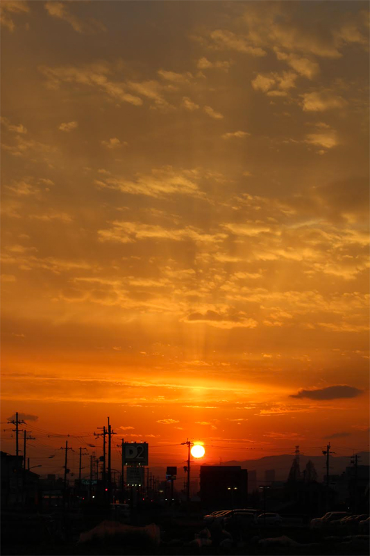 とうかえでの道に沈む夕日を招堤の田んぼ道から撮ってみました。