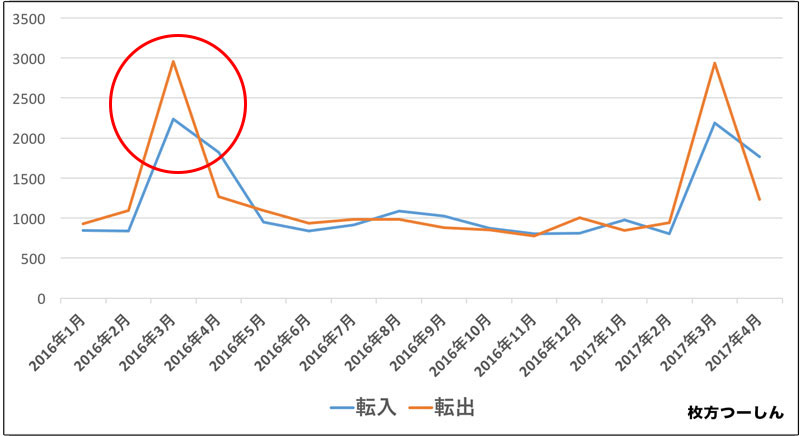 こうしてみると前年の3月・4月の数値とほぼ同じような傾向にあるので、大学生の入学・卒業にともなう引越しの影響が多そうな印象です。