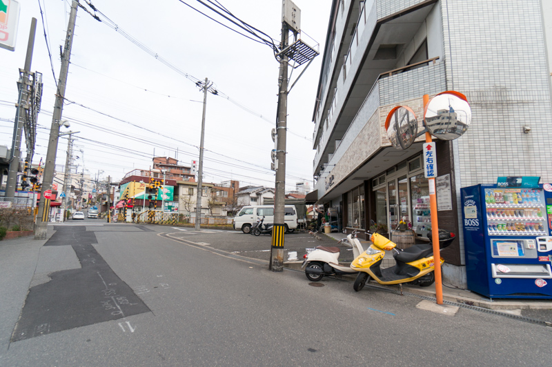 反対方向はまず交野線の踏切があり、真っ直ぐいくと急な坂道がありひらしん星ヶ丘店やおおさかパルコープ星ヶ丘店があります。