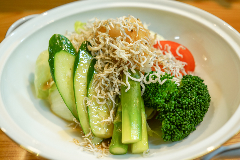 おまかせサラダ。ちりめんじゃこもかかっていて、栄養バランスばっちり