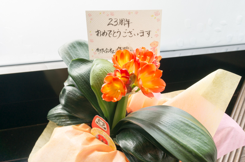 お店の入り口には、オープン23周年を迎えたお祝いのお花が飾られており、